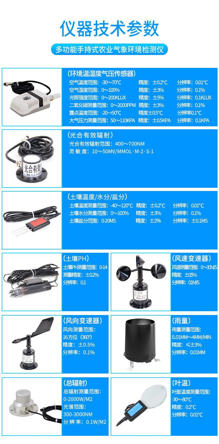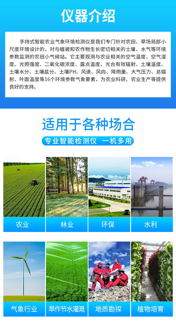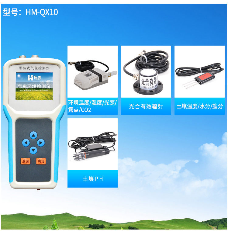 手持式智能農(nóng)業(yè)氣象環(huán)境檢測儀是我們專門針對農(nóng)田、草場局部小尺度環(huán)境設(shè)計的,對與植被和農(nóng)作物生長密切相關(guān)的土壤、水氣等環(huán)境參數(shù)監(jiān)測的農(nóng)田小氣候站。它主要觀測與農(nóng)業(yè)相關(guān)的空氣溫度、空氣濕度、光照強度、二氧化碳濃度、露點溫度、光合有效輻射、土壤溫度、土壤濕度、土壤鹽分、土壤PH等10個環(huán)境參數(shù)氣象要素,為農(nóng)業(yè)科研、農(nóng)業(yè)生產(chǎn)等提供良好的支持。