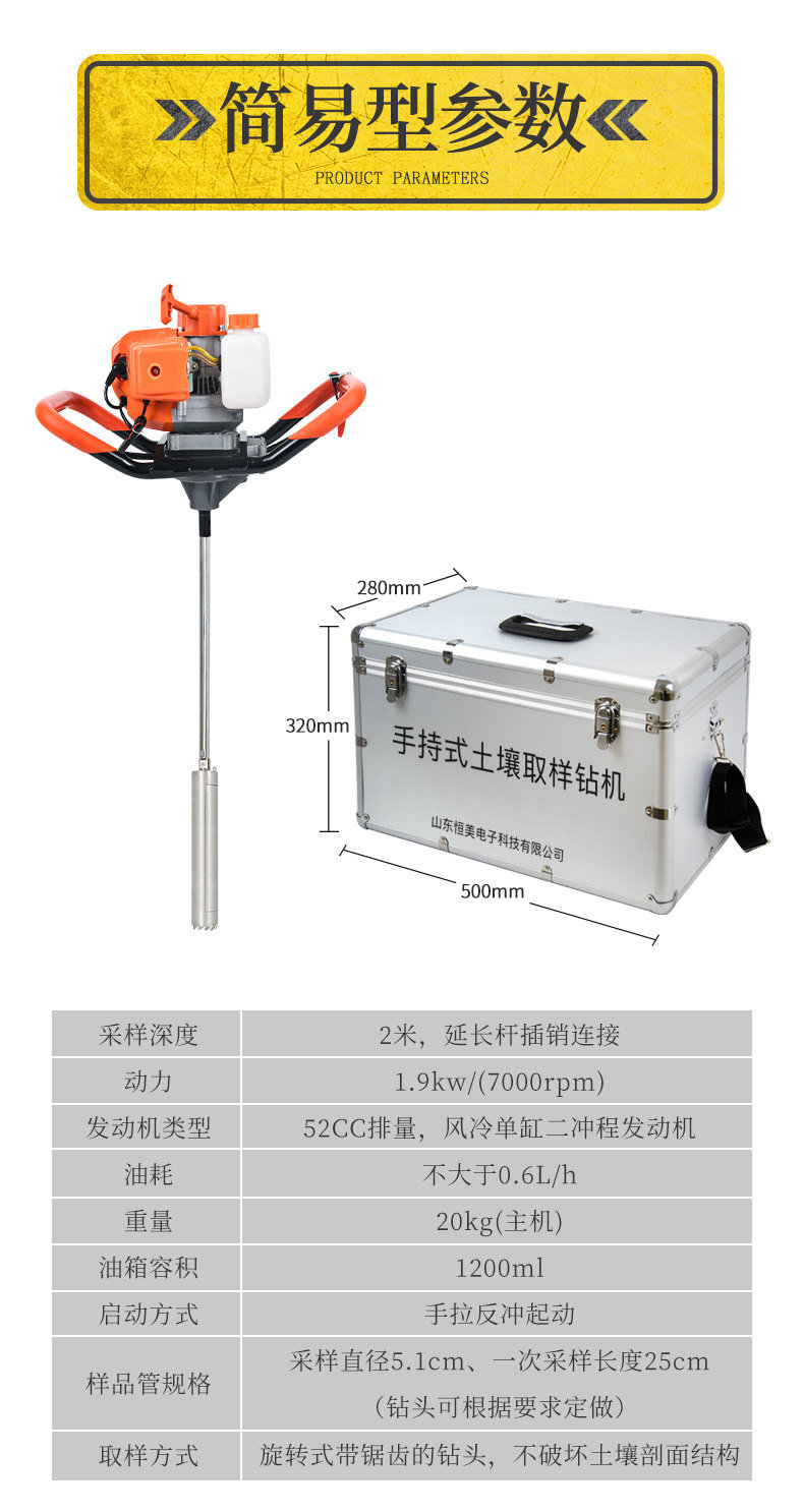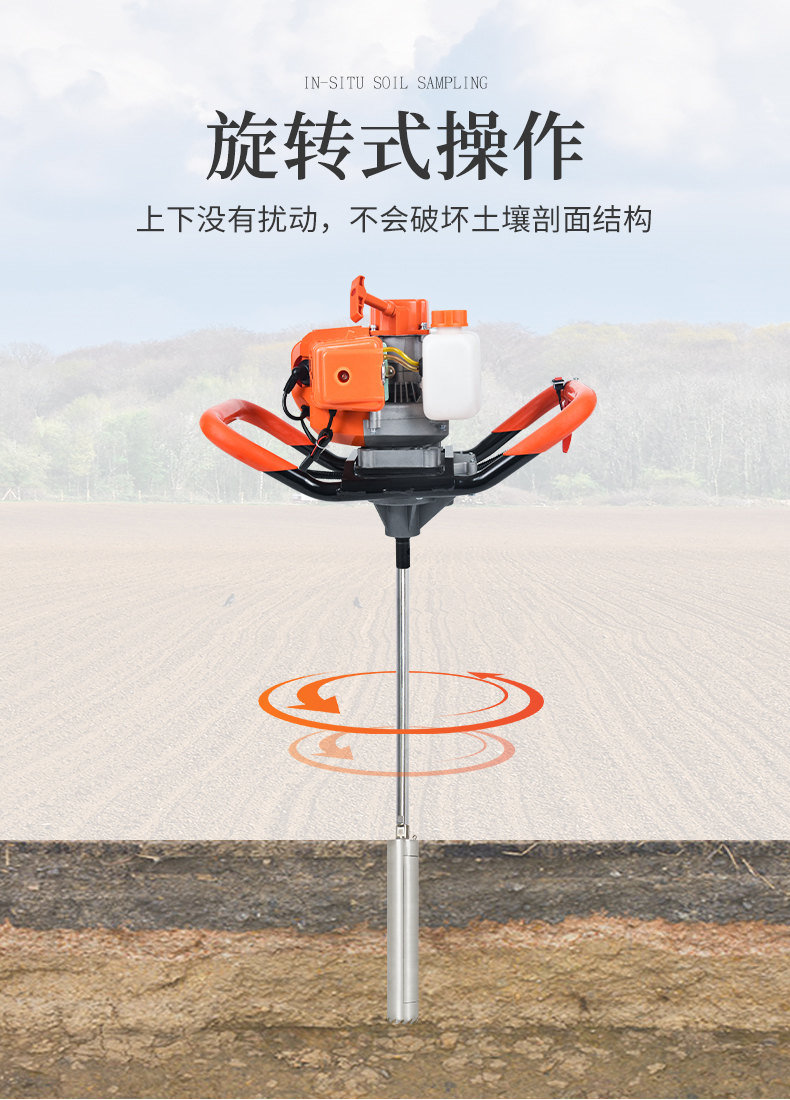 HM-QY800單人手持式土壤取樣鉆機是在參考大型液壓、汽油、氣動鉆機的基礎上設計的一款輕便的土壤采集鉆機。即使沒有操作經驗的鉆探人員,簡單培訓就可操作。取樣過程及其簡單,1到2個人即可完成設備的操作。整個鉆進過程無需加水,保證了樣品取得的質量(無污染、無擾動)。