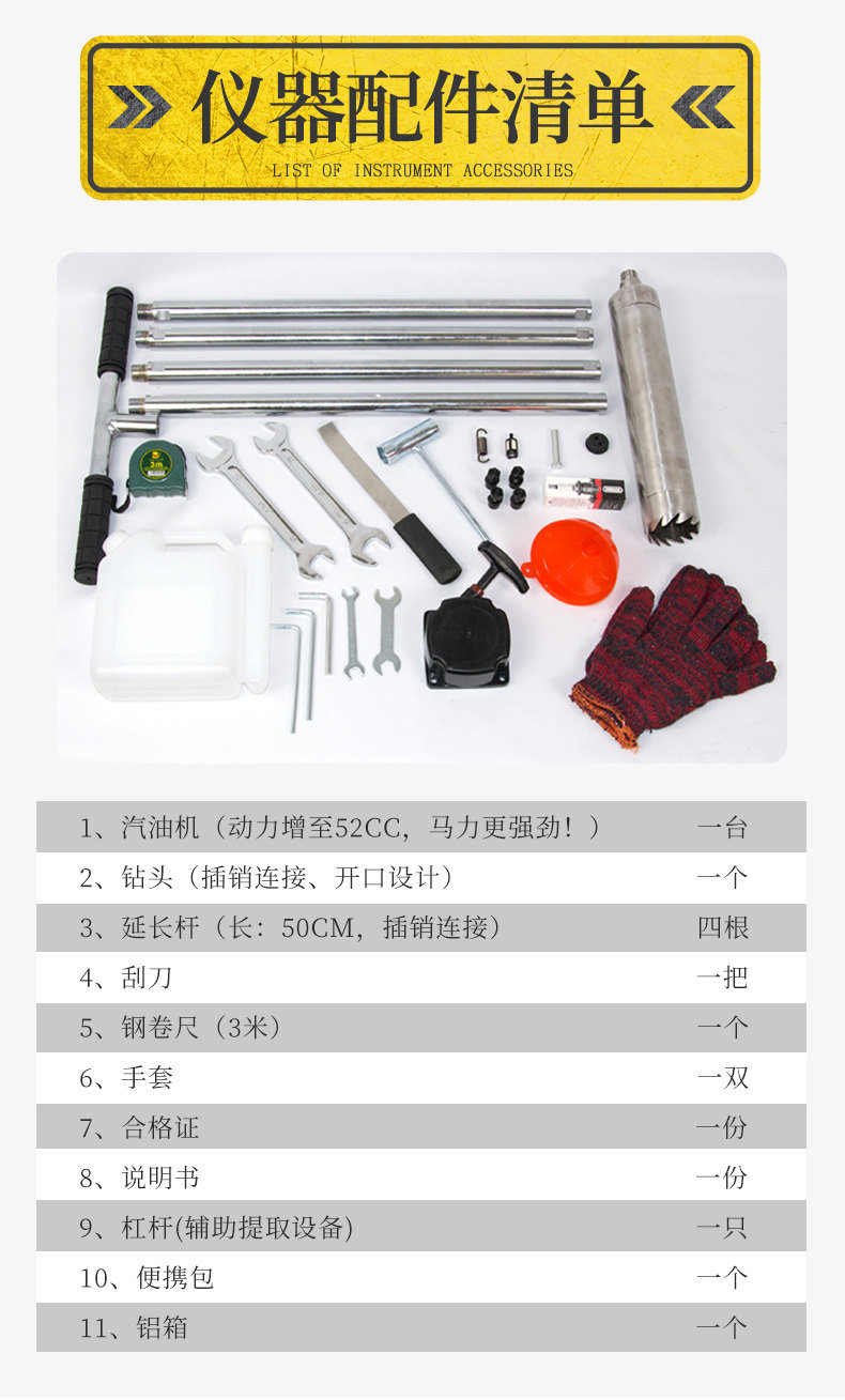 汽油動力發動機一臺,發動機工具包一套,標準土壤鉆頭、硬質土鉆頭隨意選配,不小于1米的鉆桿5根、不小于1米的塑料樣品管2根,刮刀、老虎鉗、耳機、5M卷尺、手套、清潔刷各1個,專用提取設備1套、工業塑料運輸箱1個
