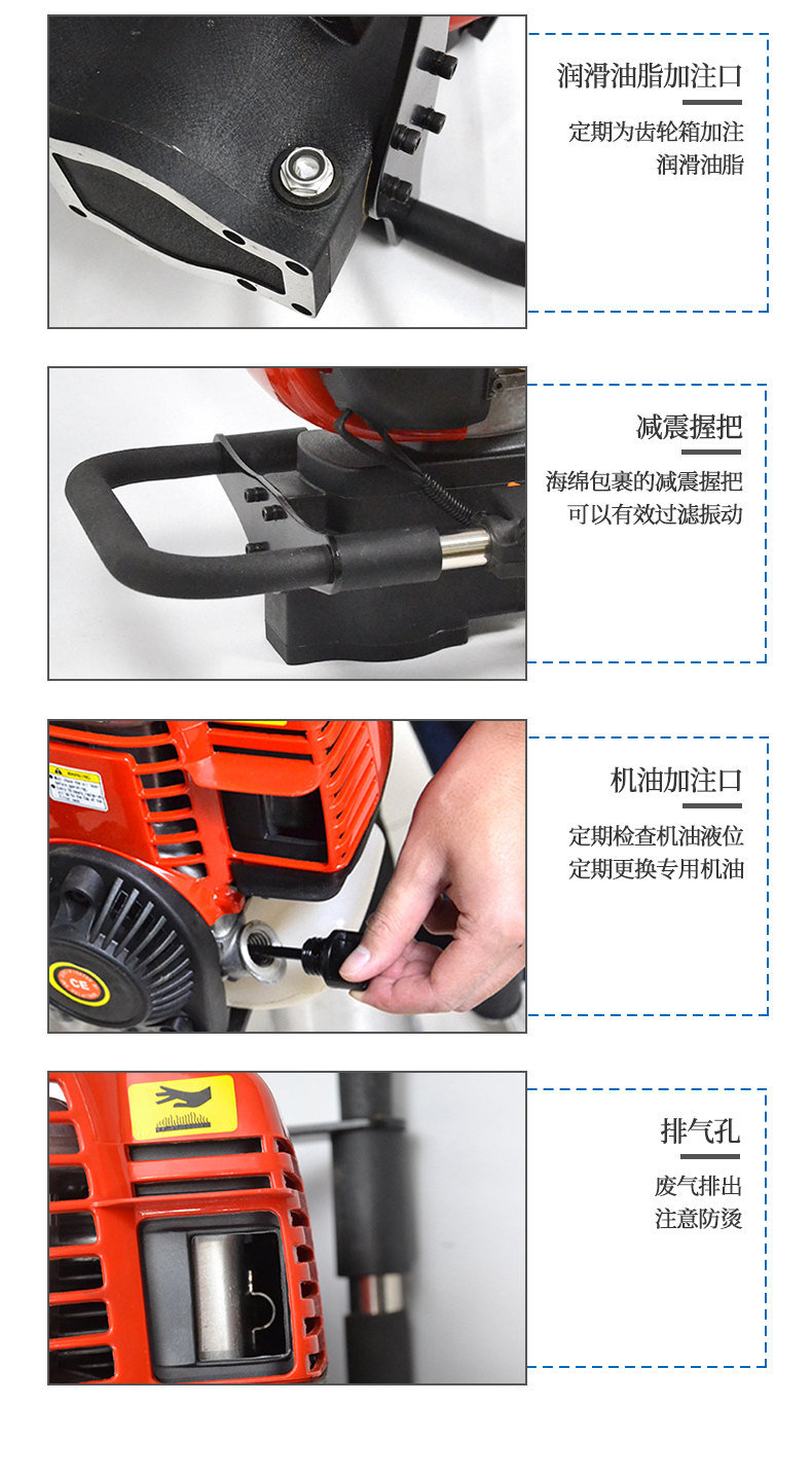 ● 手拉式啟動,即停觸發按鈕,彈簧隔離抗震手柄!