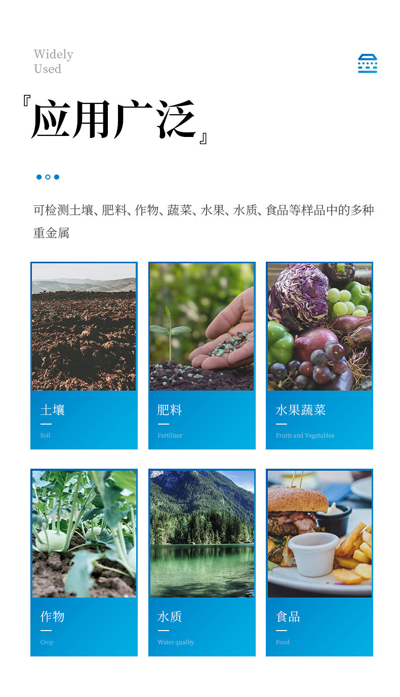 可對土壤、肥料、作物、蔬菜、水果、水質、食品等樣品中的砷、鉛、鎘、鉻、汞、鎳、鋁、氟、鈦、硒、鐵、鋅、錳、銅等進行快速聯合測定。