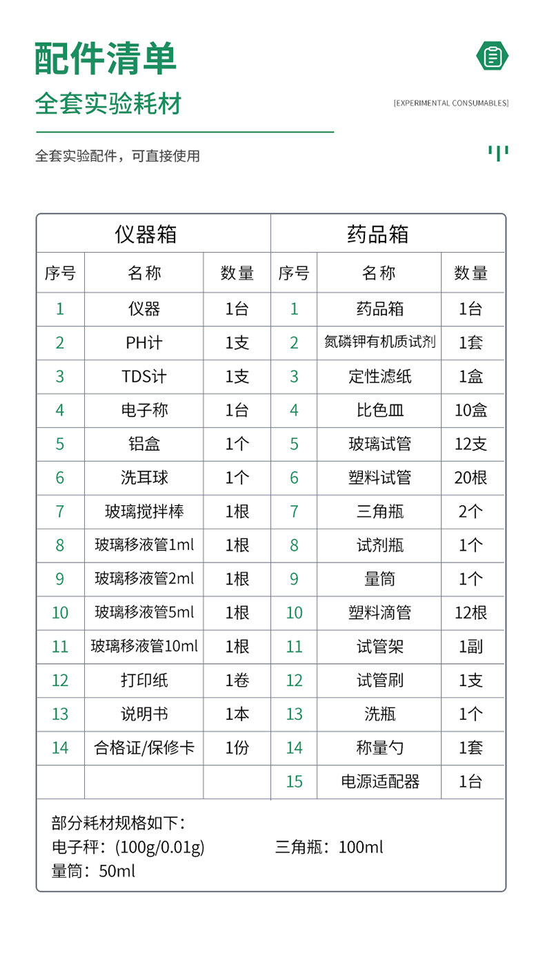 配套齊全:該儀器集藥、器、儀為一體,攜帶方便,相當于一個小型移動實驗室,無需用戶自配附件,亦可靈活野外流動測試。適于農業服務部門或農資經銷商、高教院校、科研院所、合作社、肥料廠商、大種植戶測土施肥和鑒別肥料真假及環保檢測應用。